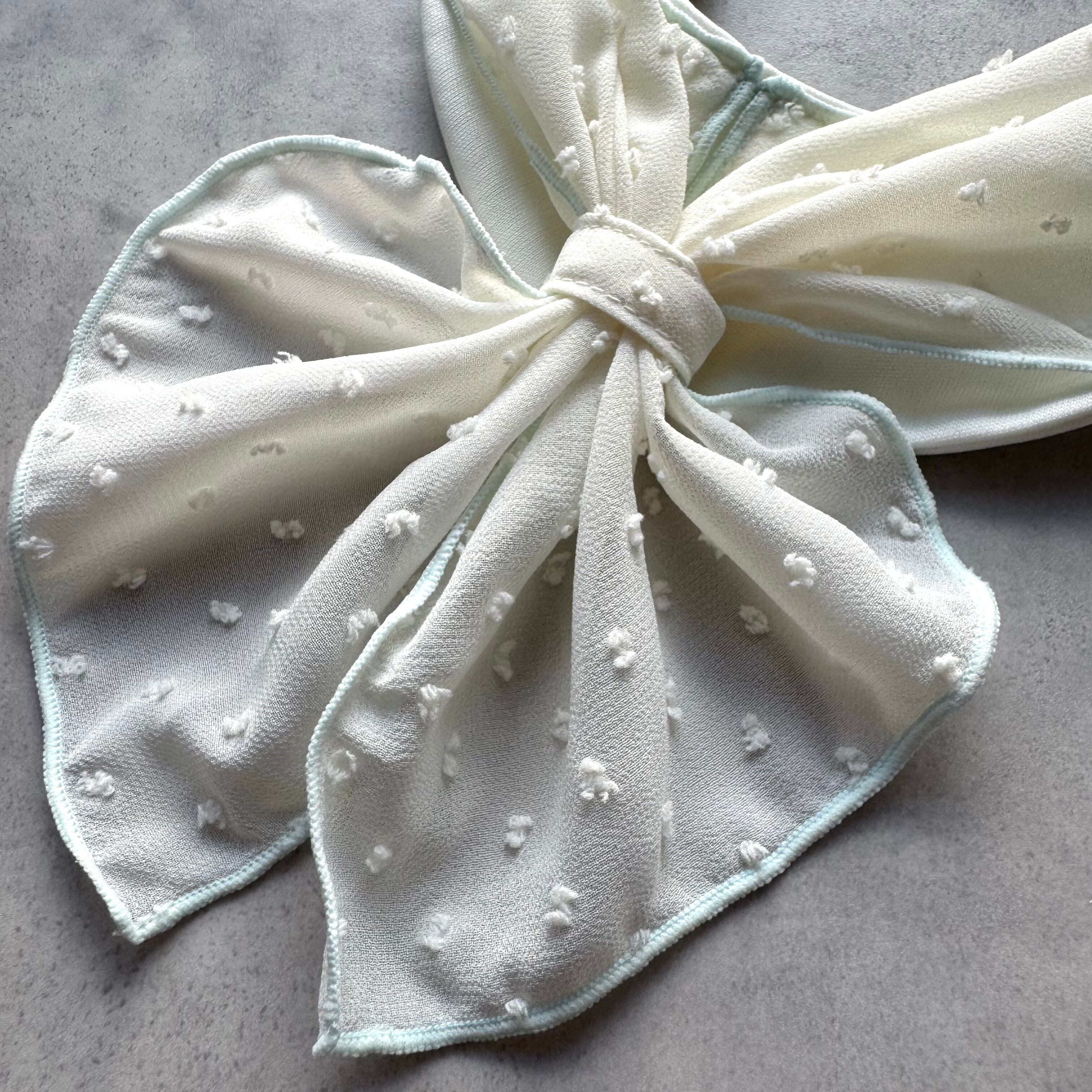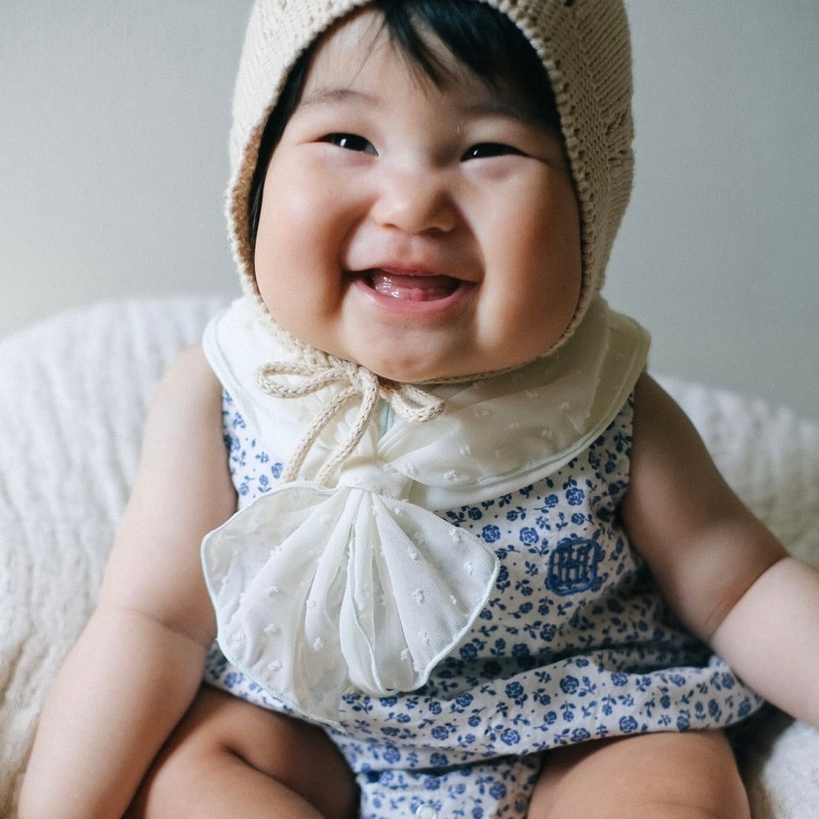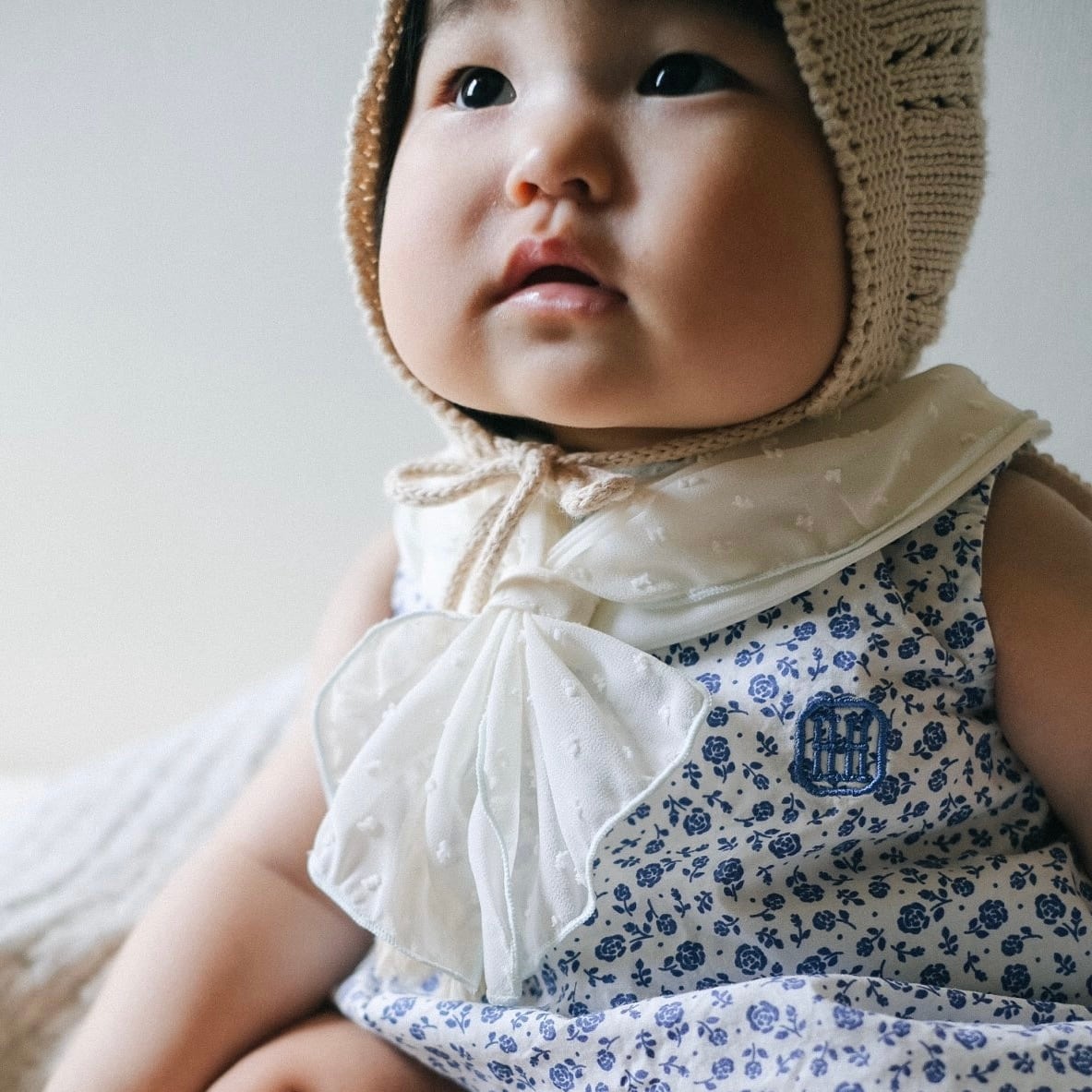 ふんわりと軽やかな風合いが赤ちゃんのお顔まわりをやさしく彩ります。小さなドットの立体感がさりげないアクセントとなり、特別感のある一枚に仕上がりました。通気性がよく、蒸れにくいため季節を問わず快適にお使いいただけます。