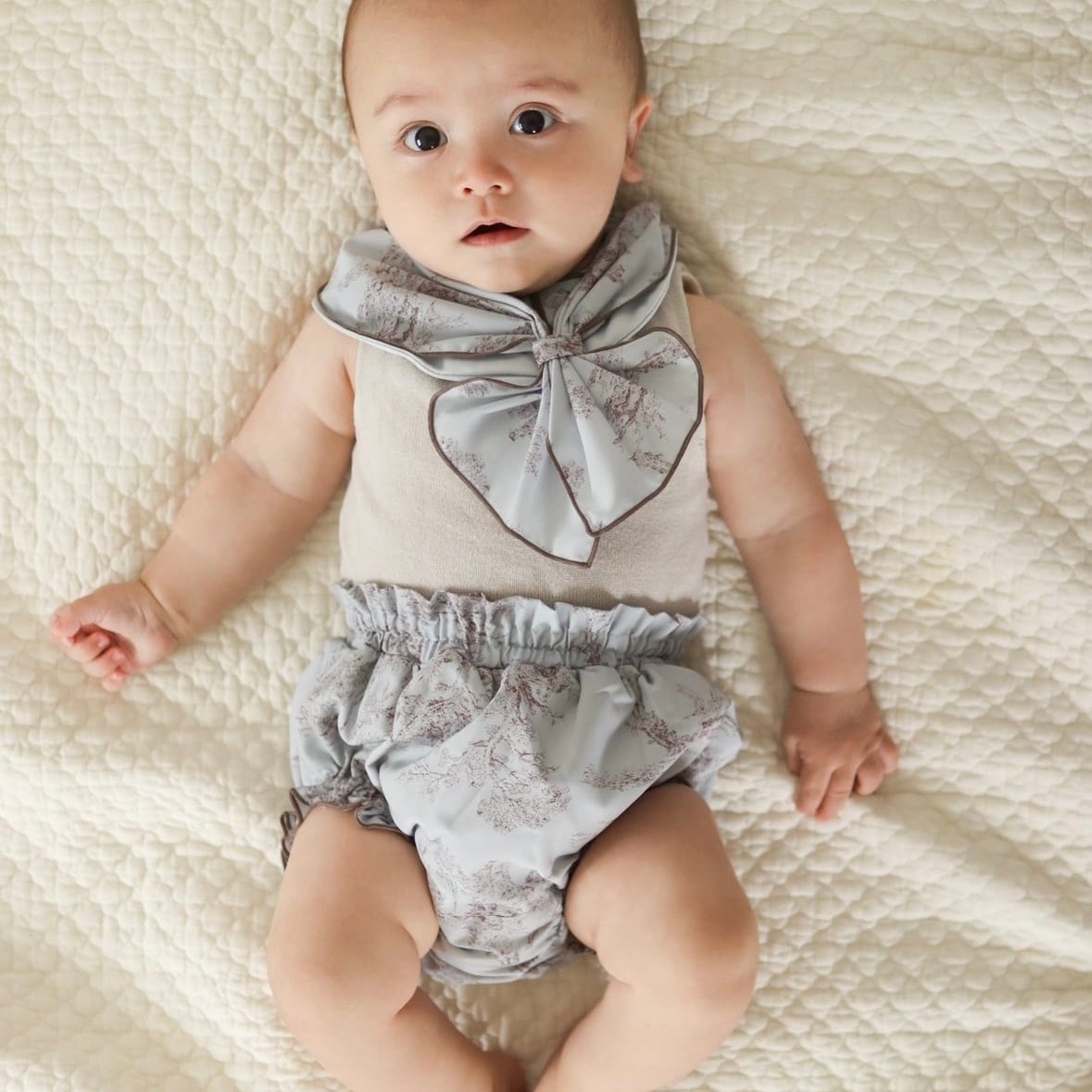 トワルドジュイ柄のスタイーフは赤ちゃんのコーディネートを上品に彩ってくれます。