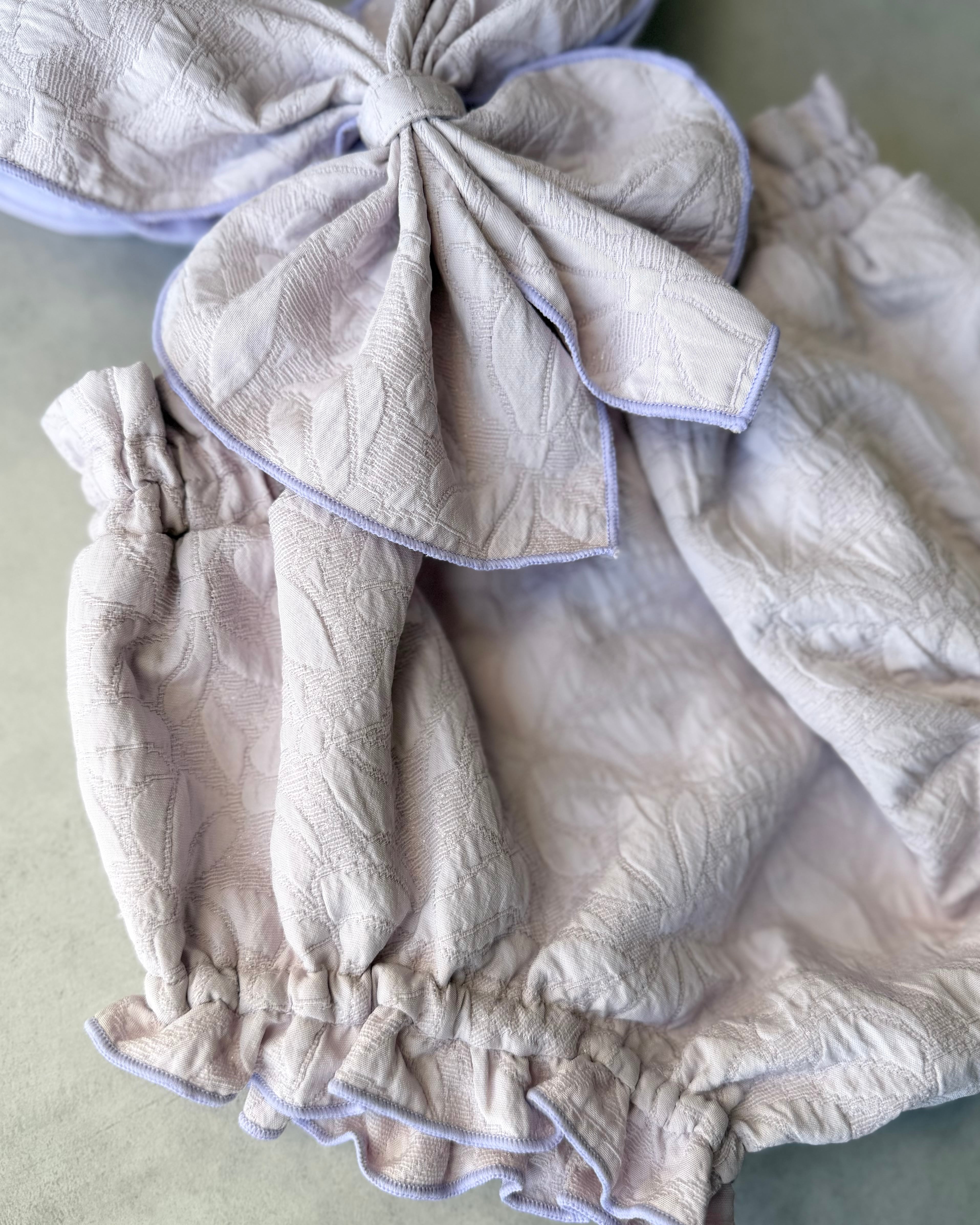 キルティングのような凹凸感のある織りに、キラッと光る糸がさりげなく織り込まれており、上品さの中に可愛らしさを添えてくれます。