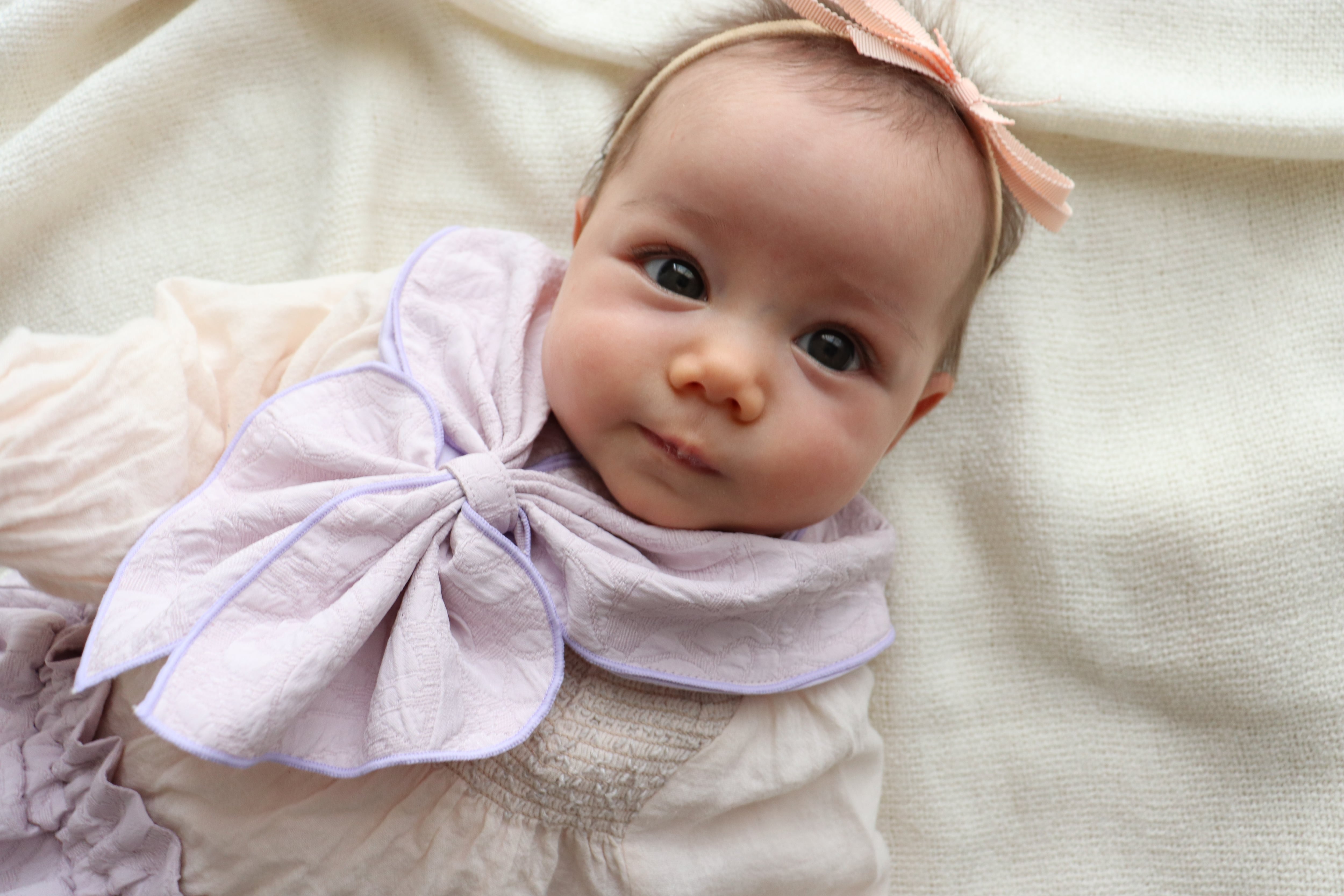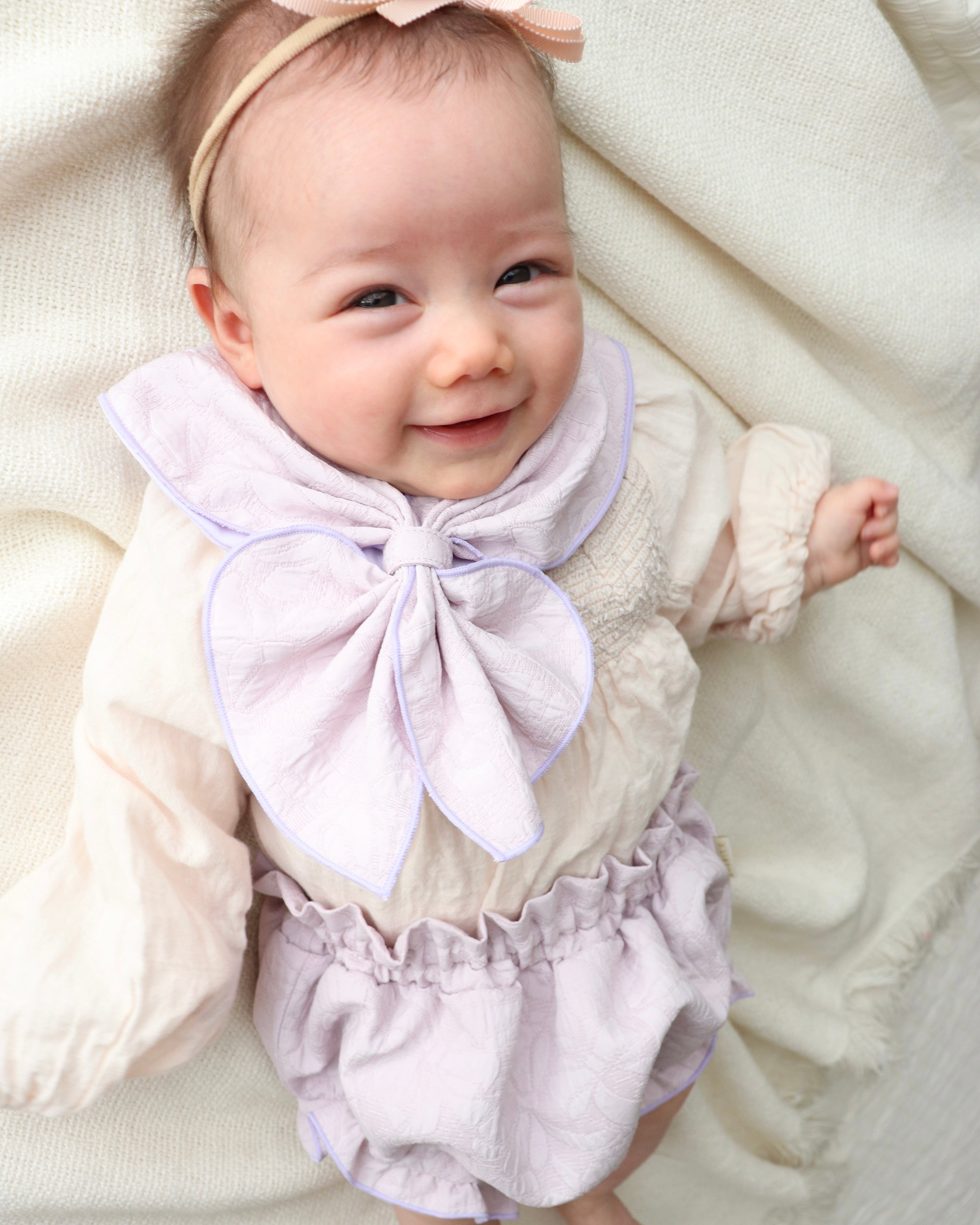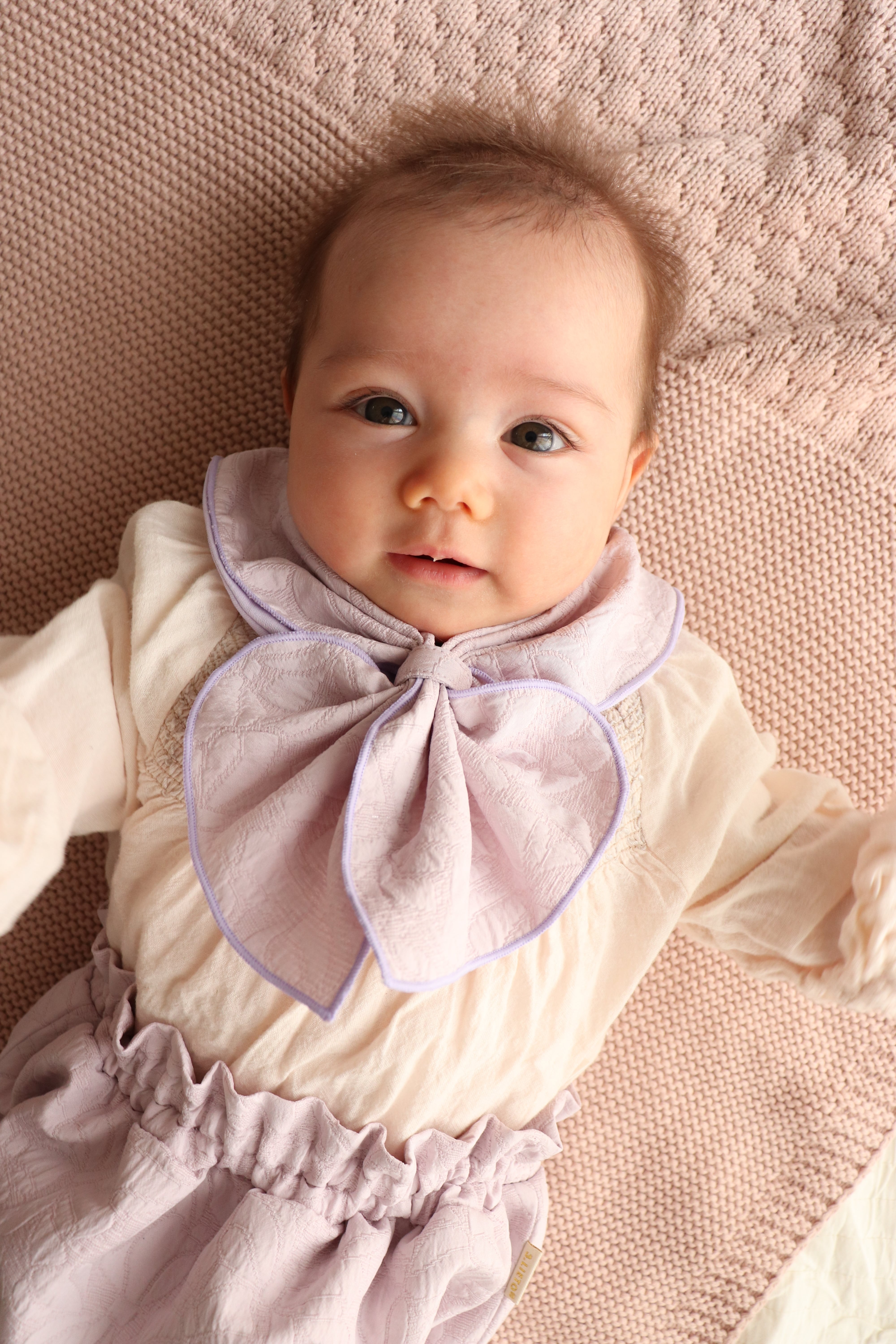 「ファッションとして楽しめるスタイ」というコンセプトをそのままに、上品さと華やかさを兼ね備えた生地を選びました。お子様の大切な日を、やさしく可憐に彩ります。